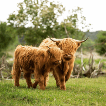 Highland Krowy szkockie charakteryzują długie rogi i falista długa sierść, która najczęściej występuje w kolorze czerwono-rudym, czarnym, brunatnym …