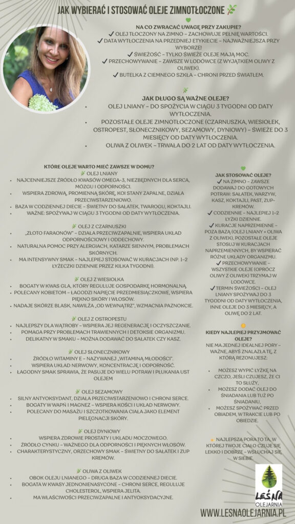 „Od ponad 20 lat jestem związana z tematyką Zdrowia… Ale to życie kilka lat temu napisało dla mnie najpiękniejszy scenariusz… Kiedy moje dzieci zaczęły chorować, szukałam naturalnych sposobów, by wspierać ich odporność. I właśnie wtedy w sercu Natury tuż obok przydomowego lasu narodziła się Leśna Olejarnia – miejsce, w którym tworzę oleje zimnotłoczone z całym sercem i czułością. Tutaj wszystko dzieje się bez pośpiechu, bez kompromisów, dokładnie tak, jak chce Natura… ”