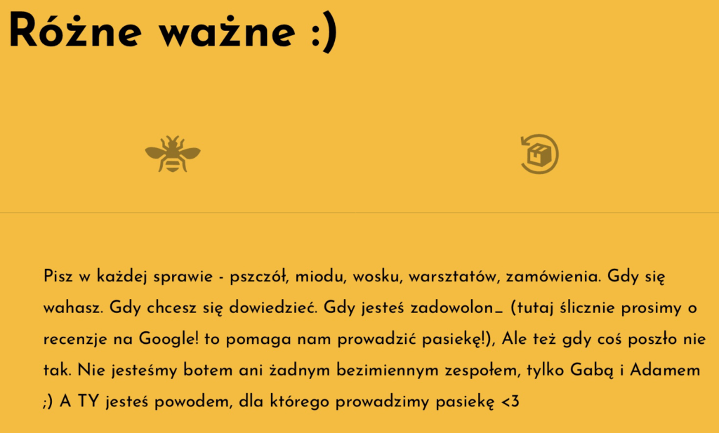 - Pisz w każdej sprawie – pszczół, miodu, wosku, warsztatów, zamówienia. Gdy się wahasz. Gdy chcesz się dowiedzieć. Gdy jesteś zadowolony (tutaj ślicznie prosimy o recenzje na Google! to pomaga nam prowadzić pasiekę!), Ale też gdy coś poszło nie tak. Nie jesteśmy botem ani żadnym bezimiennym zespołem, tylko Gabą i Adamem. A TY jesteś powodem, dla którego prowadzimy pasiekę.